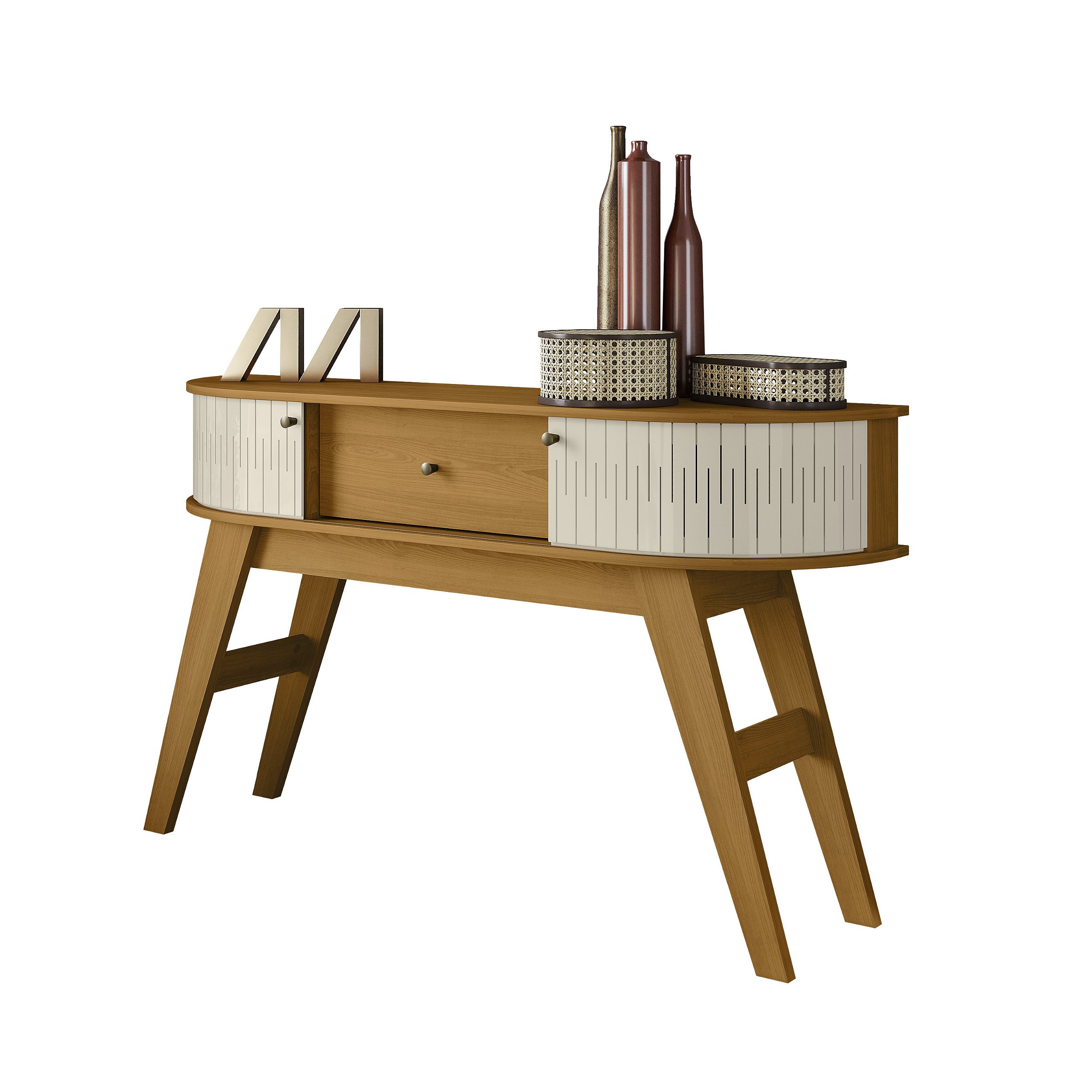 Possui detalhes curvos no tampo e na base, gavetas com corrediças telescópicas, pés “palito”, além dos puxadores em bronze que combinam perfeitamente com seu design sofisticado. É composto por chapas de MDP de 15 e 25mm.