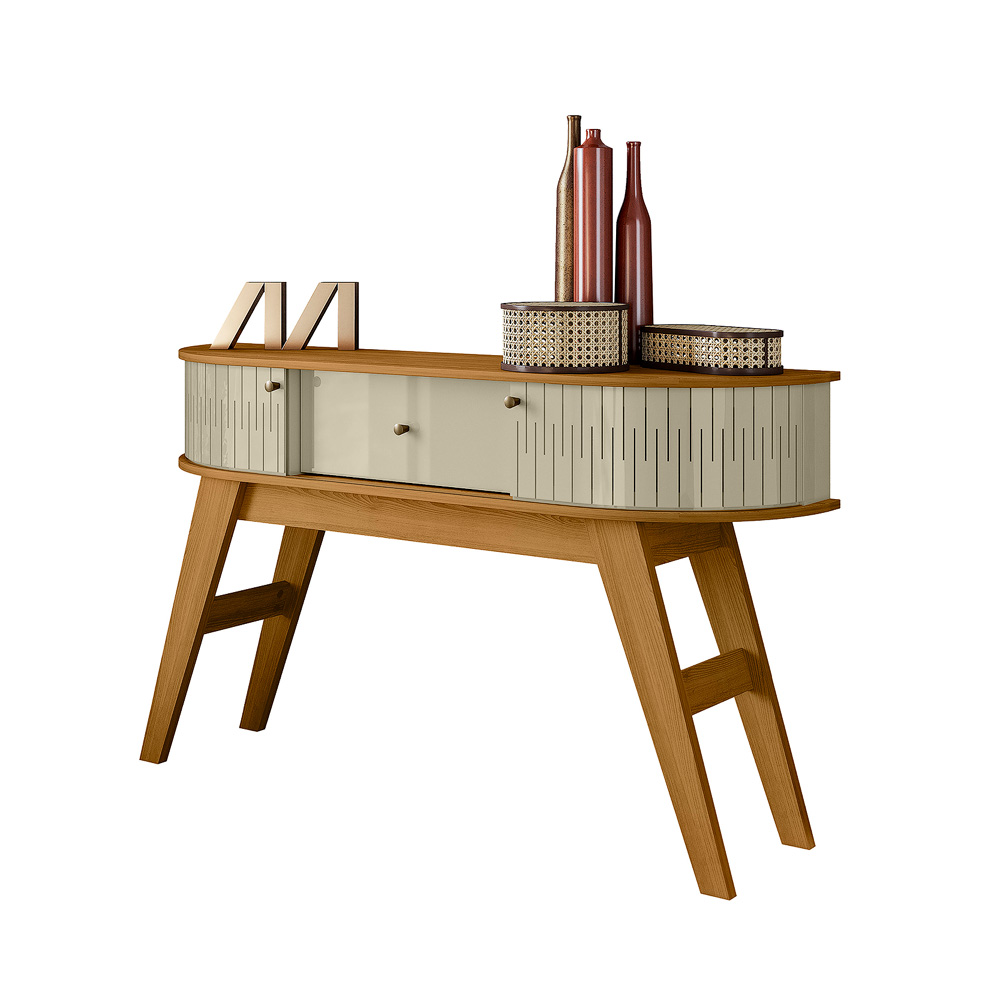 Possui detalhes curvos no tampo e na base, gavetas com corrediças telescópicas, pés “palito”, além dos puxadores em bronze que combinam perfeitamente com seu design sofisticado. É composto por chapas de MDP de 15 e 25mm.