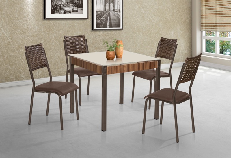Cadeira em Aço 1" -Pintura Pó Eletrostática Marrom Semi Brilho - Assento Courino BC-83 (Courino Linhão Marrom) - Encosto : Junco Sintético Marrom (J03) Mesa em Aço 40x40" - Pintura Pó Eletrostática Marrom Semi Brilho - Tampo Quadrado 0,80x0,80 -Temperado Serigrafado de 6 mm - Cor (Off White) - Travas da Mesa na cor Nogal