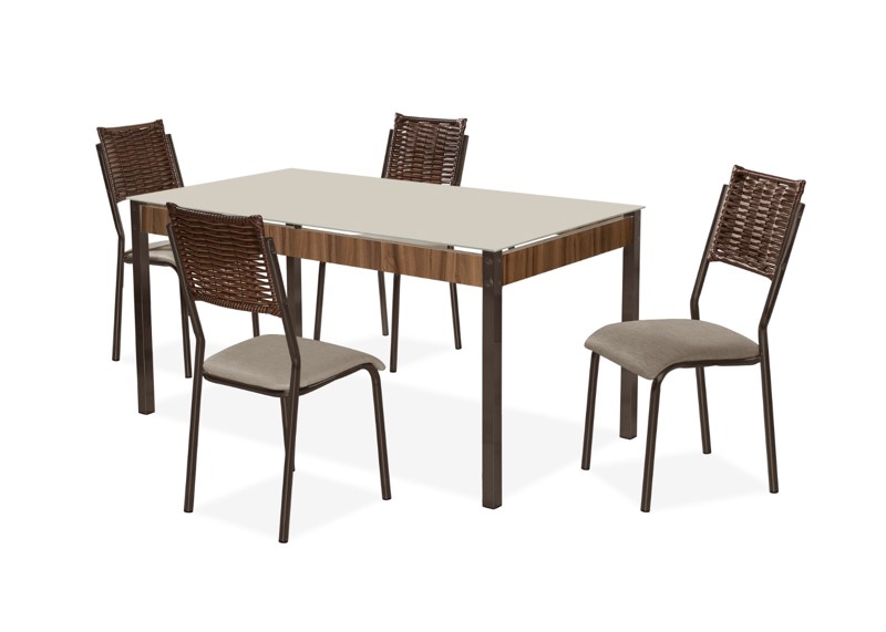 Cadeira em Aço 1" -Pintura Pó Eletrostática Marrom Semi Brilho - Assento Courino BC-80 (Courino Linhão Bege Escuro) - Encosto : Junco Sintético Marrom (J03) Mesa em Aço 40x40" - Pintura Pó Eletrostática Marrom Semi Brilho - Tampo Retangular 1,20x0,80 - Vidro Temperado Serigrafado de 6 mm - Cor (Off White) - Travas da Mesa na cor Nogal