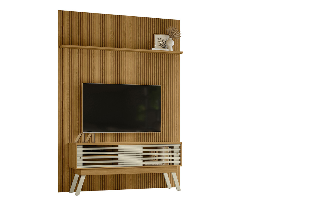 Produzida com chapas de MDP e MDF de 12, 15 e 25mm, tem dimensões de 1790mm de largura, 2445mm de altura e 420mm de profundidade, sendo ideal para TVs de até 65 polegadas.