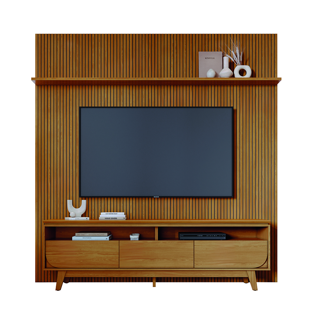 Com pés usinados e estrutura composta por chapas de MDP e MDF de 12, 15 e 25mm, a composição é robusta e durável. Suas dimensões de 2380mm de largura, 2445mm de altura e 400mm de profundidade permitem acomodar TVs de até 75 polegadas, oferecendo sofisticação e funcionalidade para sua casa.