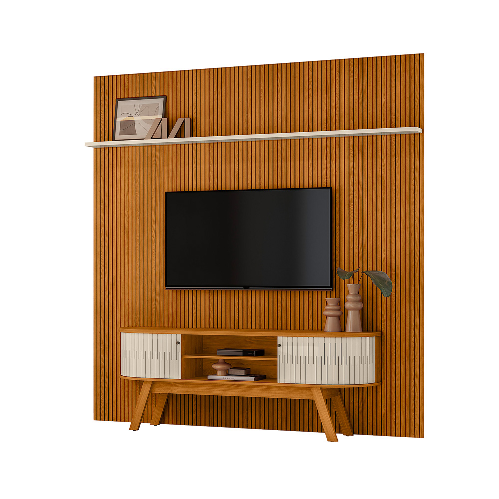 Produzida com chapas de MDP e MDF de 12, 15 e 25mm, possui dimensões de 2380mm de largura, 2445mm de altura e 415mm de profundidade, suportando TVs de até 75 polegadas.
