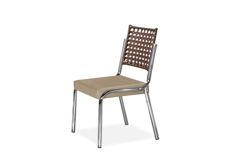Cadeira Aço Cromado Polido- Assento Tecido courino linhão Bege- Encosto em Junco Sintético Marrom com Proteçaõ Anti UV